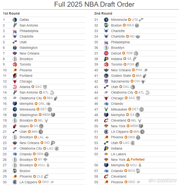 这是最新的签位表,因为选秀前有一些交易产生,第十顺位已经回到太阳手中,13号签是老鹰,14号签是马刺。