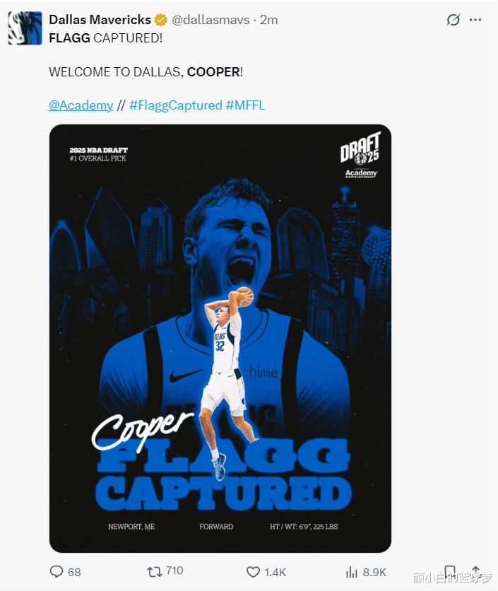 毫无悬念达拉斯独行侠用状元签选中了库珀-弗拉格,这位穿鞋身高2.06米的超级新星将联手欧文、戴维斯组成三状元阵容。
