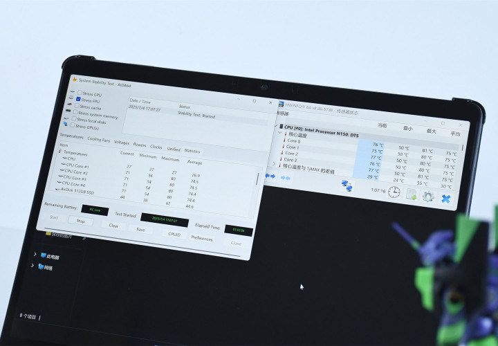 我用AIDA64对其进行约1个小时的“单烤FPU”测试,Hi10 Max的CPU温度在70℃左右。这个温度表现,对于一台二合一平板电脑而言,应该还算不错了吧?并且在高负载的“单烤FPU”测试下,散热风扇的声音也不是很大。