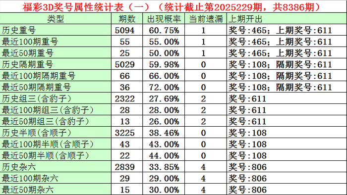 福彩3D上期奖号为108,上期重号轮空。最近100期重号开出55期,开出比例55%,最近50期重号开出25期,开出比例50%,最近10期重号开出 5期,出现比例为50%,本期注意重号出现。
