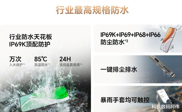 IP69K满级防水防尘又是什么? 这可不只是防个雨水那么简单。咱们来科普一下,IP68是我们熟知的最高级防尘防水,意味着能在水下浸泡。而IP69K,代表能承受高达86℃的高温高压水流冲洗! 这是工业级的防护标准,意味着你可以用洗车的高压水枪对着它冲,它都毫发无伤。对于经常面对恶劣天气和复杂环境的户外工作者来说,这就是最顶级的安全感。